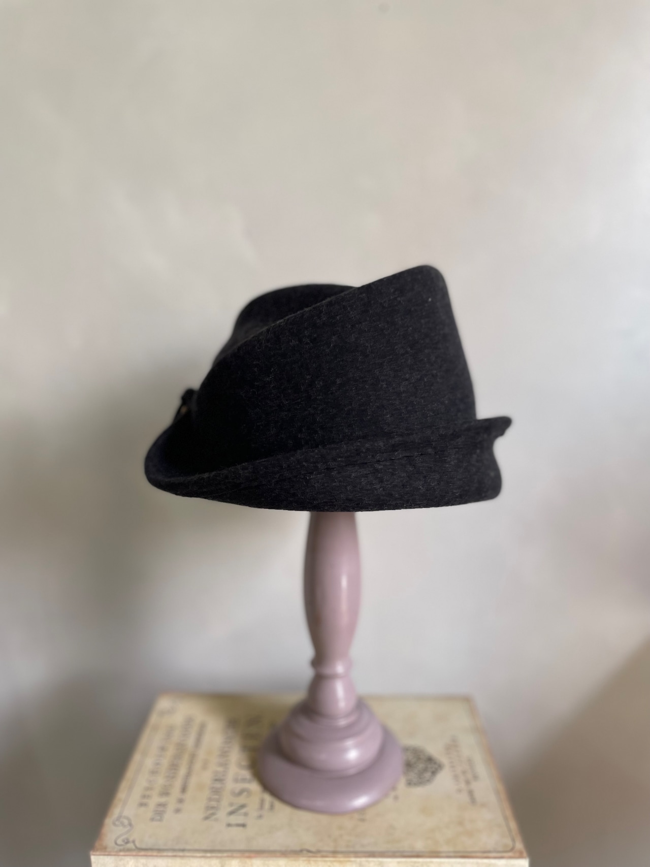 チャコールグレーの深い色味がシックな印象を与え、サテンリボンがポイントとなってます。