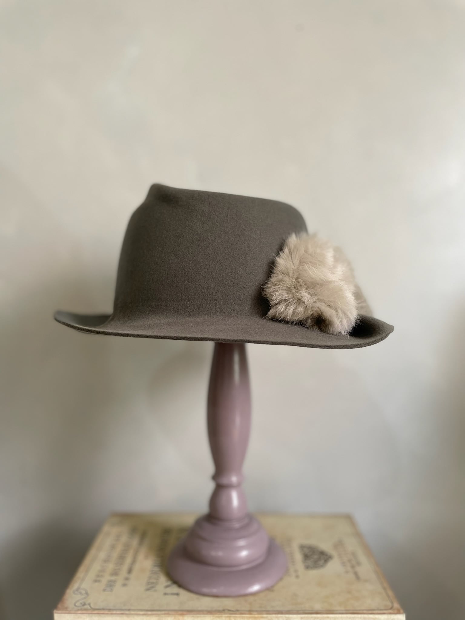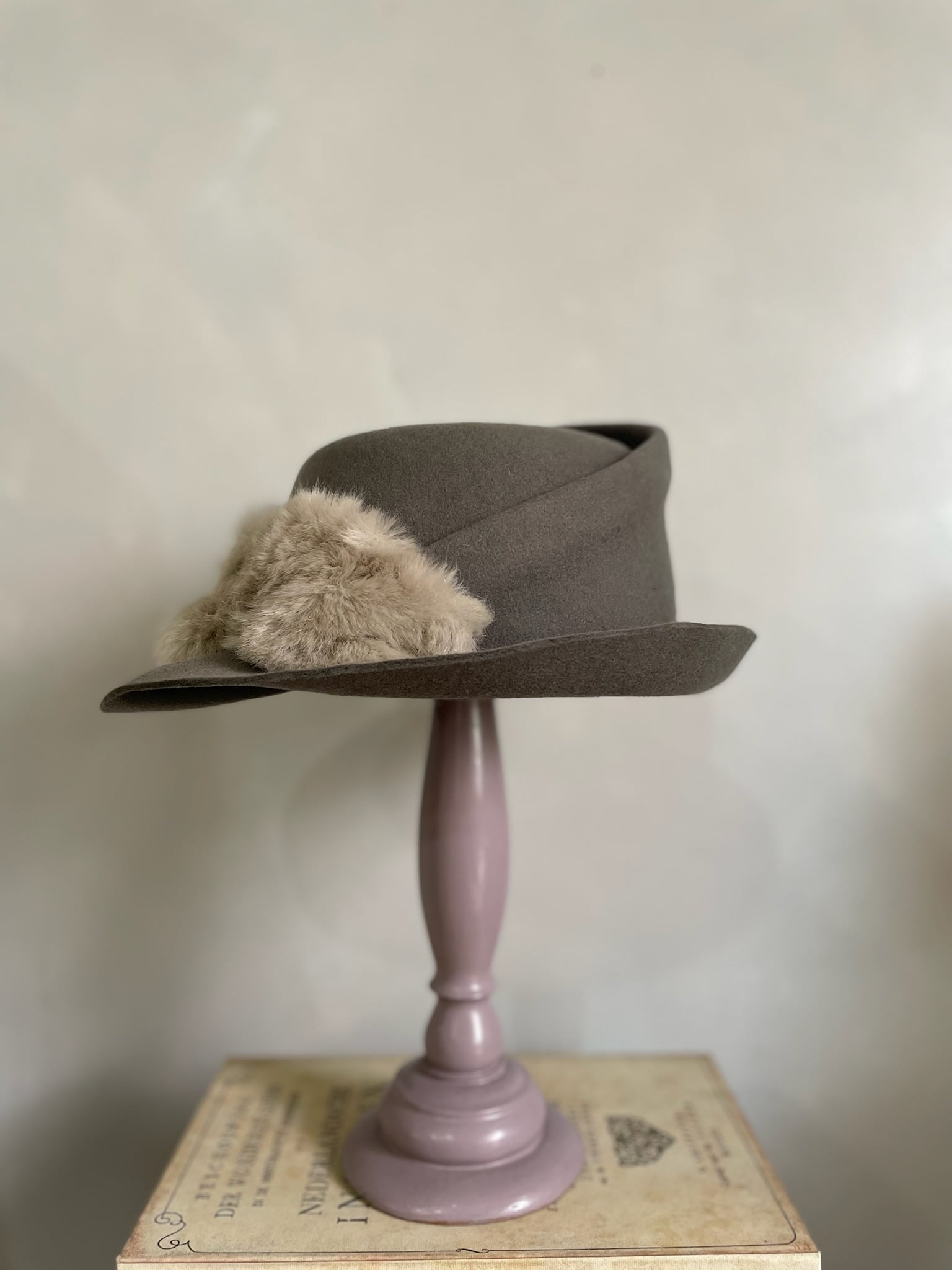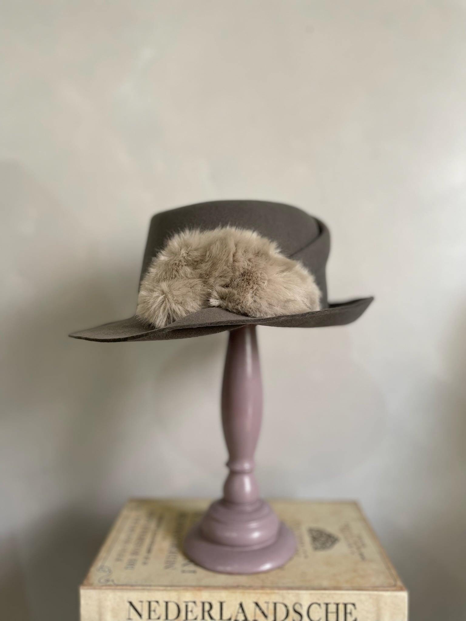 フェイクファーを贅沢に使用した変形中折れハット。